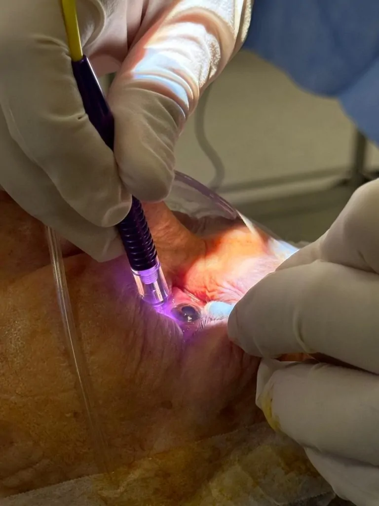 Procedimento indicado para reduzir a produção do humor aquoso, auxiliando no controle da pressão intraocular em casos de glaucoma avançado.