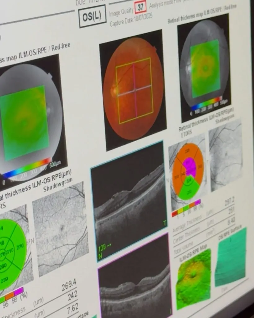 Exame de imagem de alta resolução que utiliza tecnologia a laser para obter cortes detalhados das estruturas internas do olho, como retina e nervo óptico.